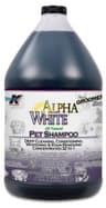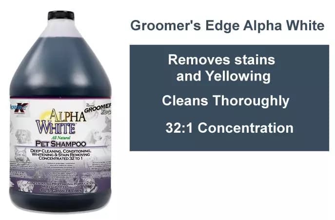 Groomer's Edge Alpha White Pet Shampoo removes stains and yellowing from pets with white coats or markings. It gently and deeply cleans, brightens white, removes stains, takes away yellowing. It deodorizes and leaves hair lustrous and shiny.