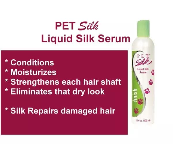 The Ultimate finishing product. Pet Silk Liquid Silk Serum Top Coat adds volume, shine and a silky feel to your pet’s coat.