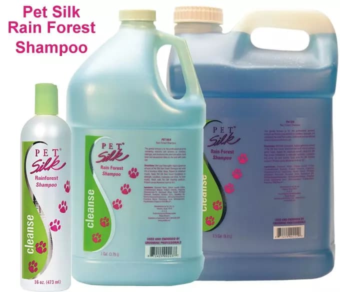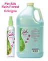 Pet Silk RainForest Dog Shampoo, Conditioner and Cologne. A natural leafy and vaguely floral scent. Enriched with natural silk fibers to help strengthen the coat and bring out natural shine. Dilutes up to 16:1 for economical use.