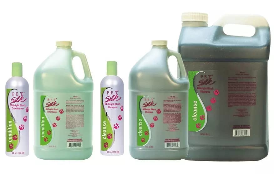 Pet Silk Midnight Black Dog Shampoo and Conditioner provides deep shine and rich luster to dark coats.