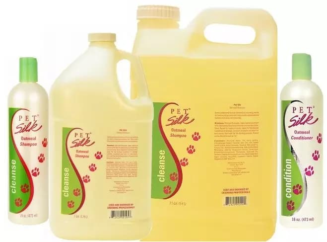 Pet Silk Oatmeal Dog Shampoo and Conditioner soothes irritated skin, holds moisture and helps repair damaged skin and coat.