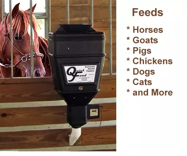 QuickFeed Automatic Horse Feeders have a programmable timer to feed grain, pellets, or kibble up to 12 times per day. Up to 50 lb capacity.